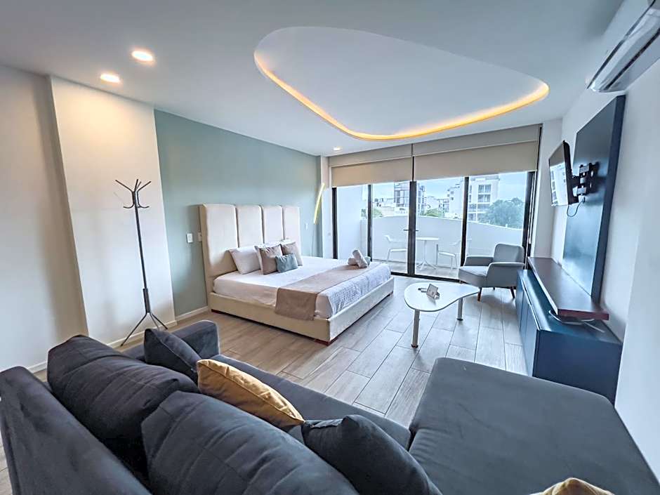 Experience luxury and comfort in our spacious Superior Suite. With a size of 603 sqft and featuring a city view, kitchen, private bathroom, and balcony, this suite is perfect for a family of 3 adults and 1 child. Enjoy the convenience of a washing machine, microwave, coffee machine, and flat-screen TV, while staying cool with air conditioning.